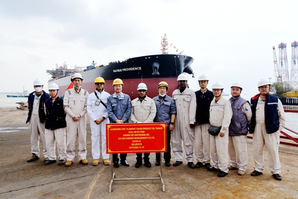 挪威船東Frontline公司現(xiàn)場(chǎng)經(jīng)理raman率領(lǐng)船檢、船級(jí)社代表等嘉賓在現(xiàn)場(chǎng)觀看下水全過(guò)程。